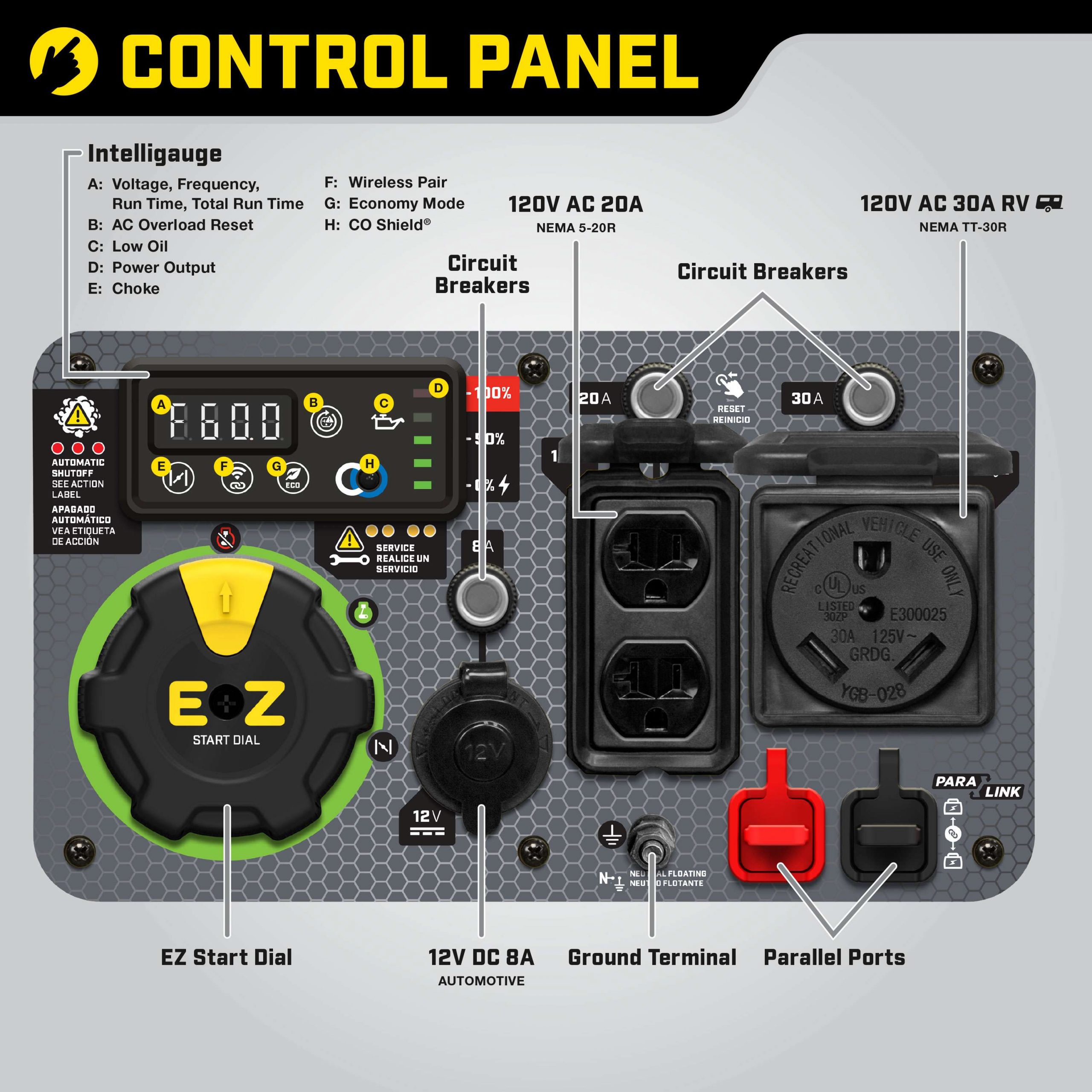 Monitor voltage, frequency and operating hours with ease, plus the EZ Start Dial simplifies startup while Economy Mode monitors power consumption in real time