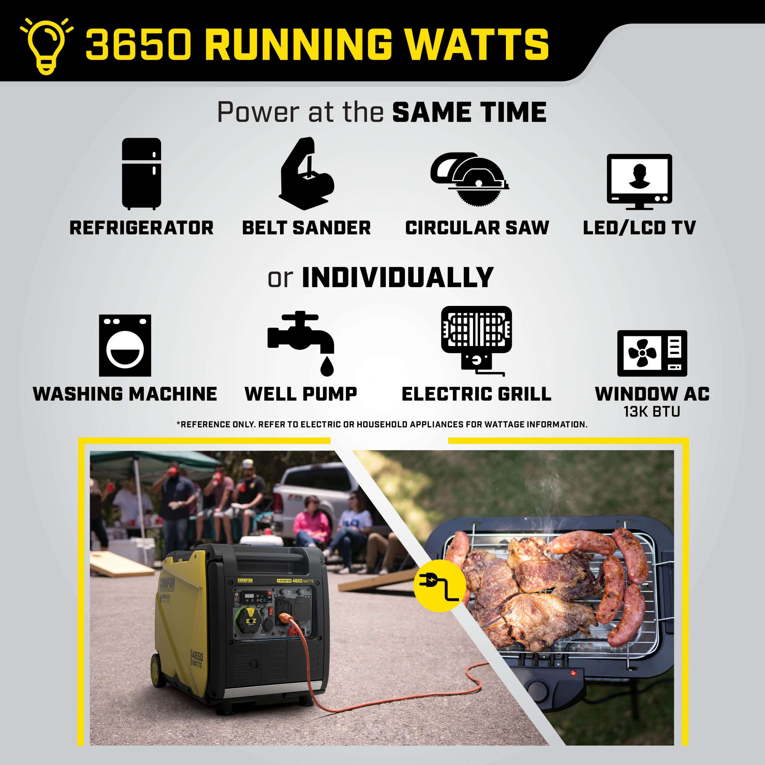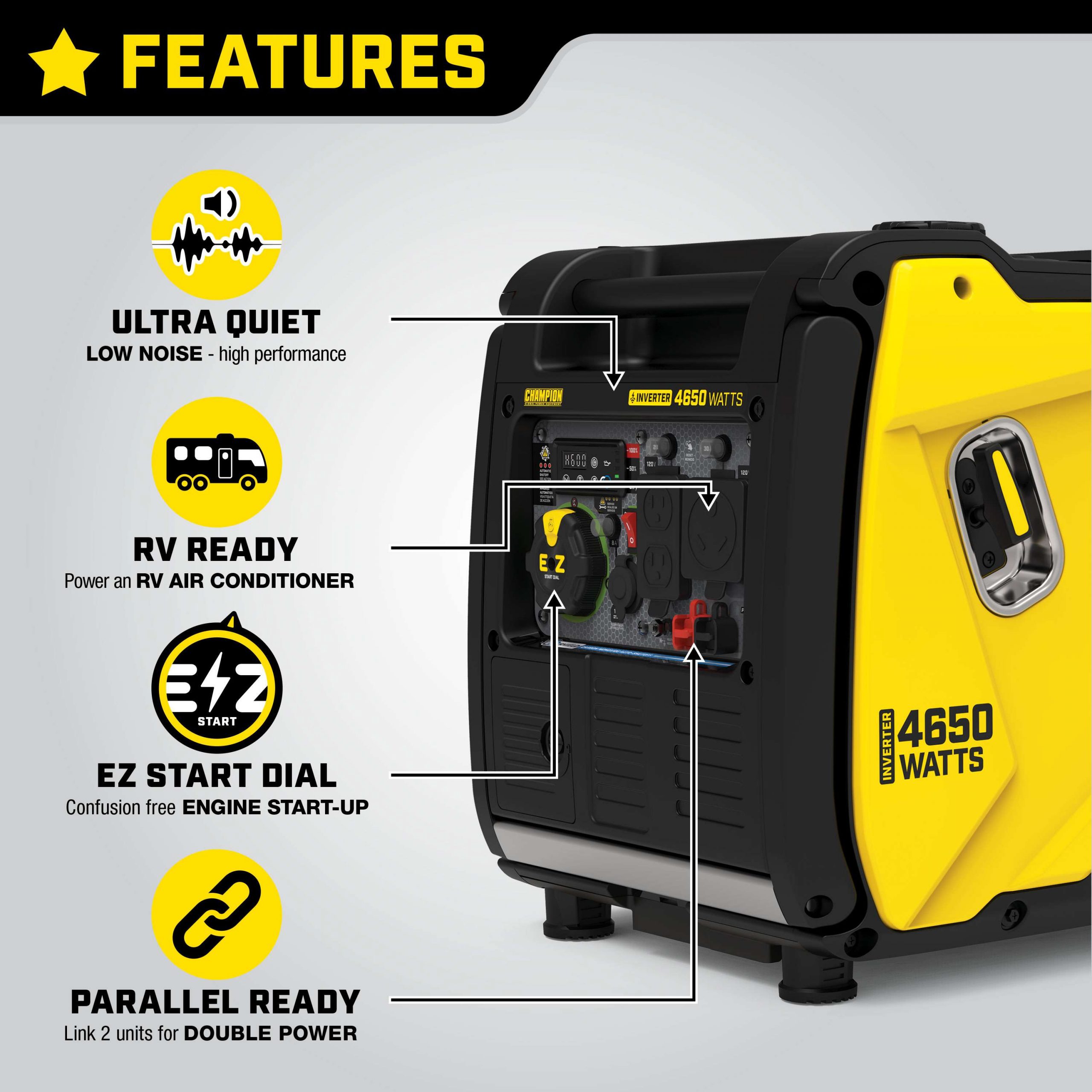 The Champion Power Equipment 4650-Watt Inverter Generator with CO Shield® is ultra-quiet and ideal for camping, tailgating, powering items around the RV or providing backup for your essentials.