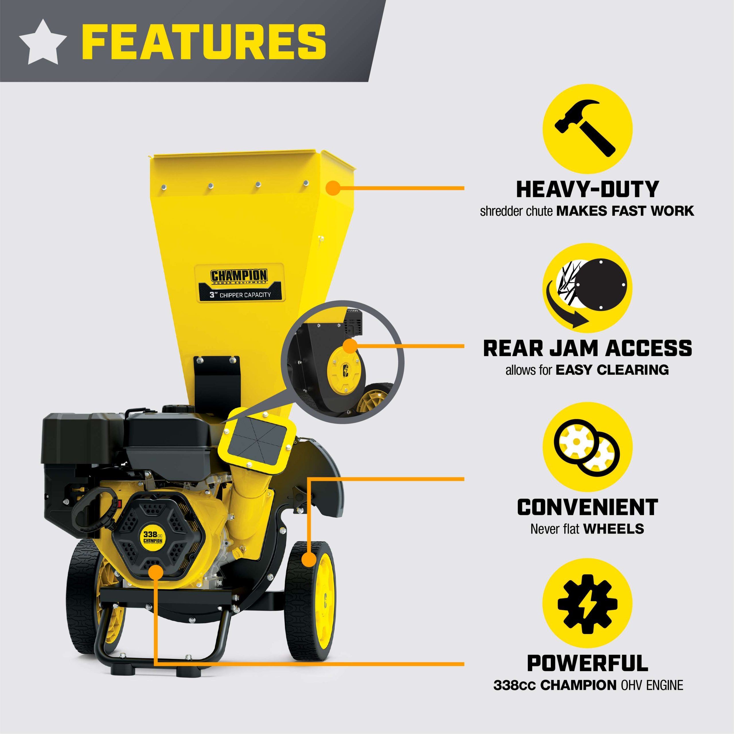 338cc Champion single-cylinder OHV engine with a 1.45-gallon fuel tank and 1.2-quart oil capacity provides the power for fast, heavy-duty and hassle-free chipping and shredding