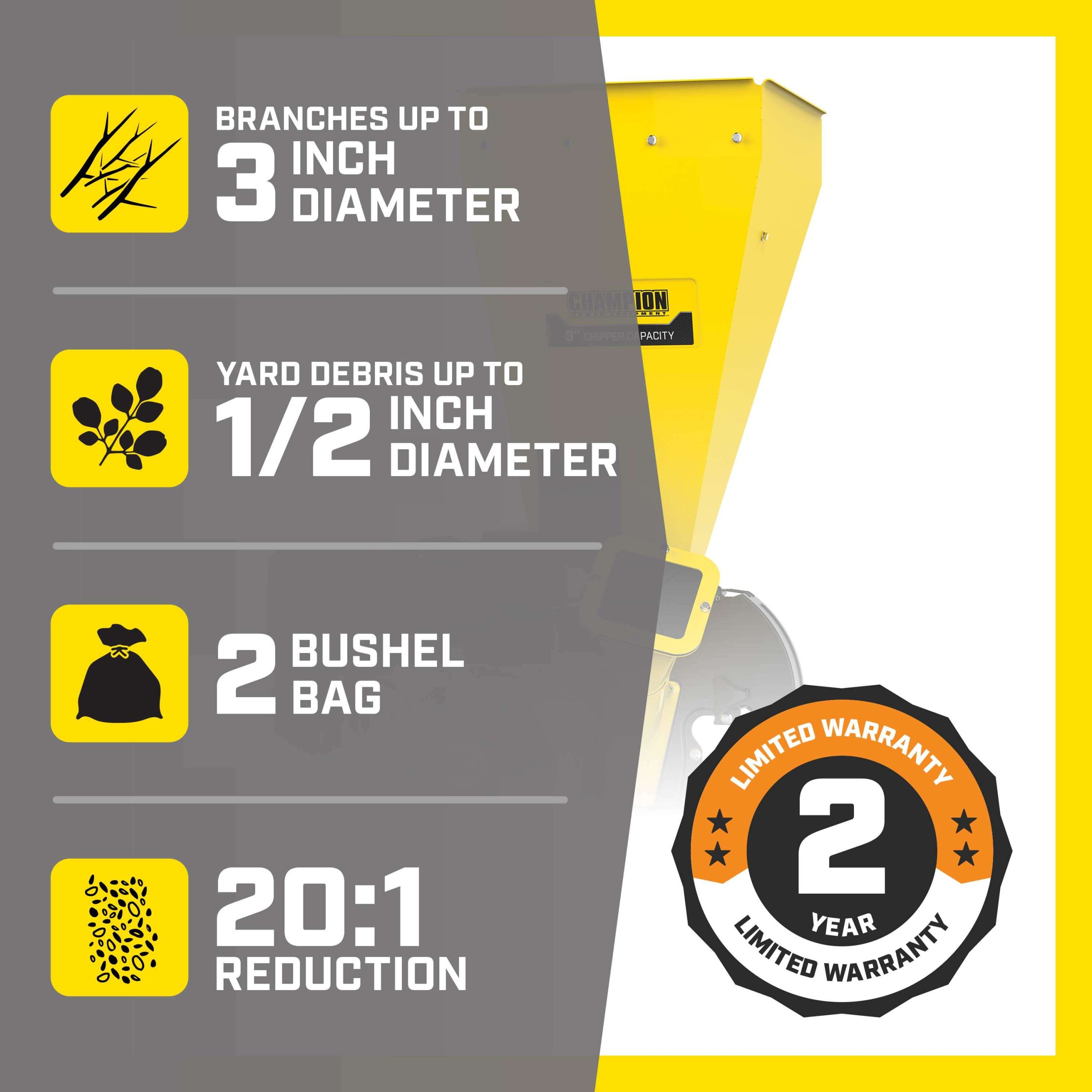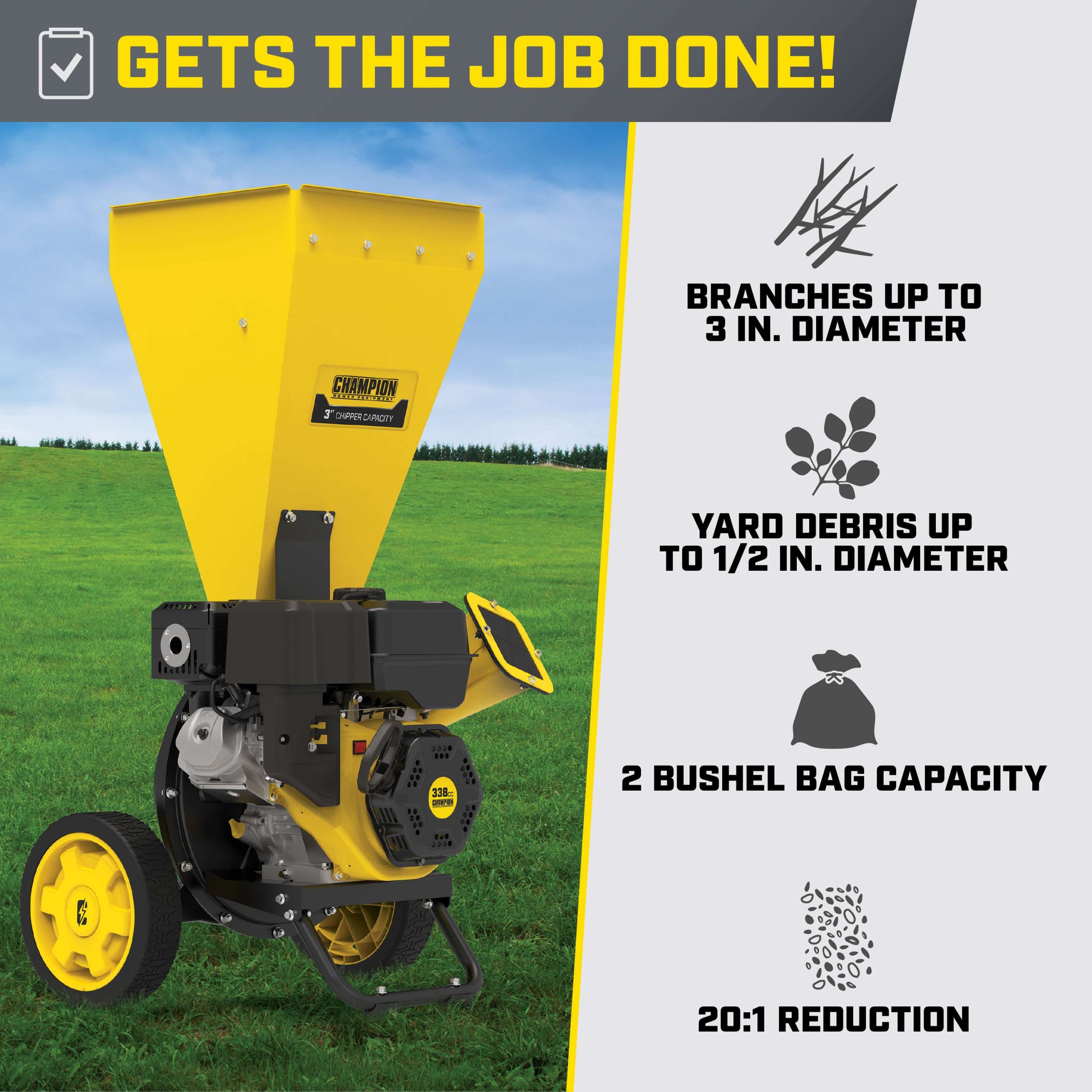 The Champion Power Equipment 201353 3-inch Portable Chipper-Shredder is designed to dependably deal with branches, brush, leaves, and yard debris by transforming them into mulch or decorative accents for your yard. This efficient machine allows you to reduce 20 bags of leaves and debris to only 1 bag.