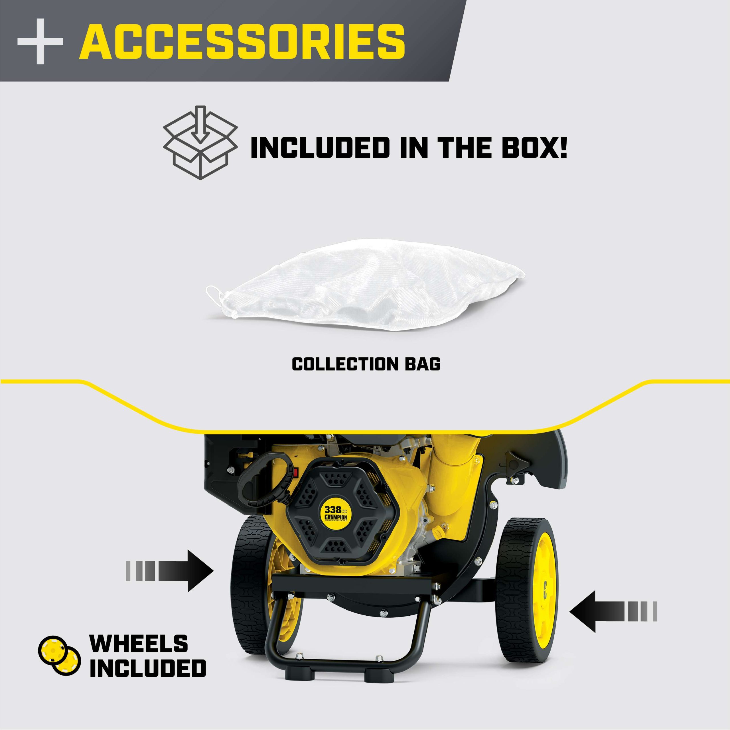 The durable steel frame is built to last. Powered by a 338cc Champion single-cylinder OHV engine with a 1.45-gallon fuel tank and designed with a low oil shut-off sensor, this unit has a 1.2-quart oil capacity (recommended 10W-30).